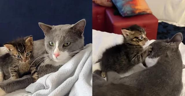 索克斯有时会试图教阿呆一些猫咪的行为方式,可阿呆却表现得不觑大猫,炸毛弓背想和索克斯一较高下。
